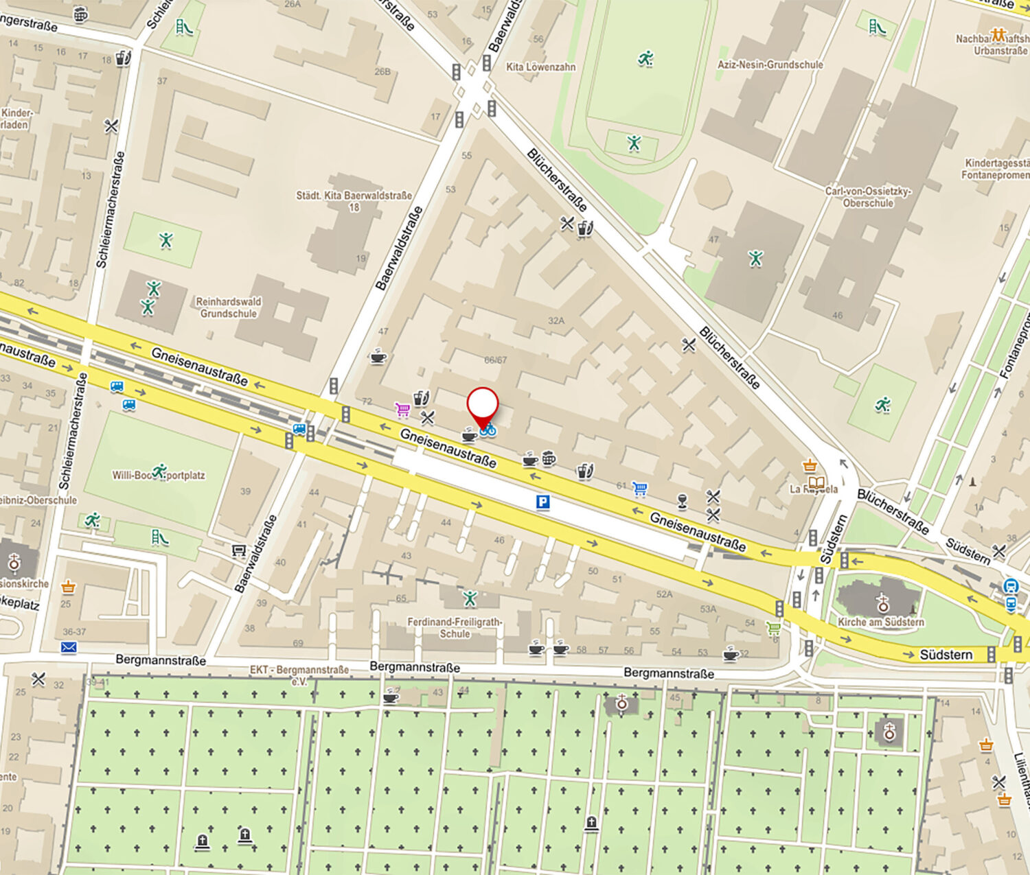 Die Gneisenaustraße liegt mitten im Kreuzberger Kiez und bildet eine der wichtigsten West-Ost-Verbindungen im südlichen Zentrum Berlins. Der Bergmannkiez mit zahlreichen Cafés, Restaurants, Supermärkten und Einzelhandelsgeschäften liegt nur wenige Minuten zu Fuß vom Gewerbehof der GSG entfernt.