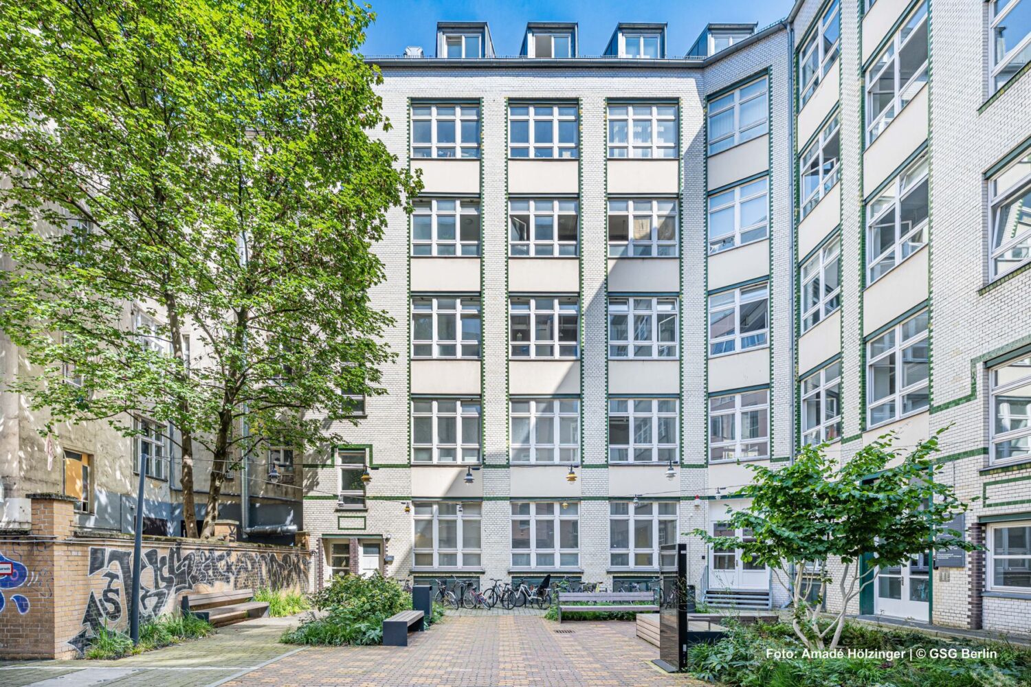 Arbeiten und leben, dazu noch in einem inspirierenden Umfeld voller Gegensätze – diese Dinge lassen sich in diesem Gewerbehof der GSG in der Adalbertstraße in Berlin-Kreuzberg aufs Wunderbarste verknüpfen: So kann man türkische Spezialitäten der dort angesiedelten Geschäfte, Restaurants oder Bäckereien genießen, während drum herum ein ambitioniertes Szenepublikum agiert.Der Hof wurde im letzten Jahr durch zwei moderne Neubauten ergänzt (Schließung von zwei Baulücken). Auch wurden die Außenanlagen durch farbige Akzente, einladendes indirektes Licht in den Durchgängen, maximale Nutzfläche unter den Bäumen, bodentiefe Beete und Sitzmöglichkeiten für Mieter und Besucher aufgewertet.