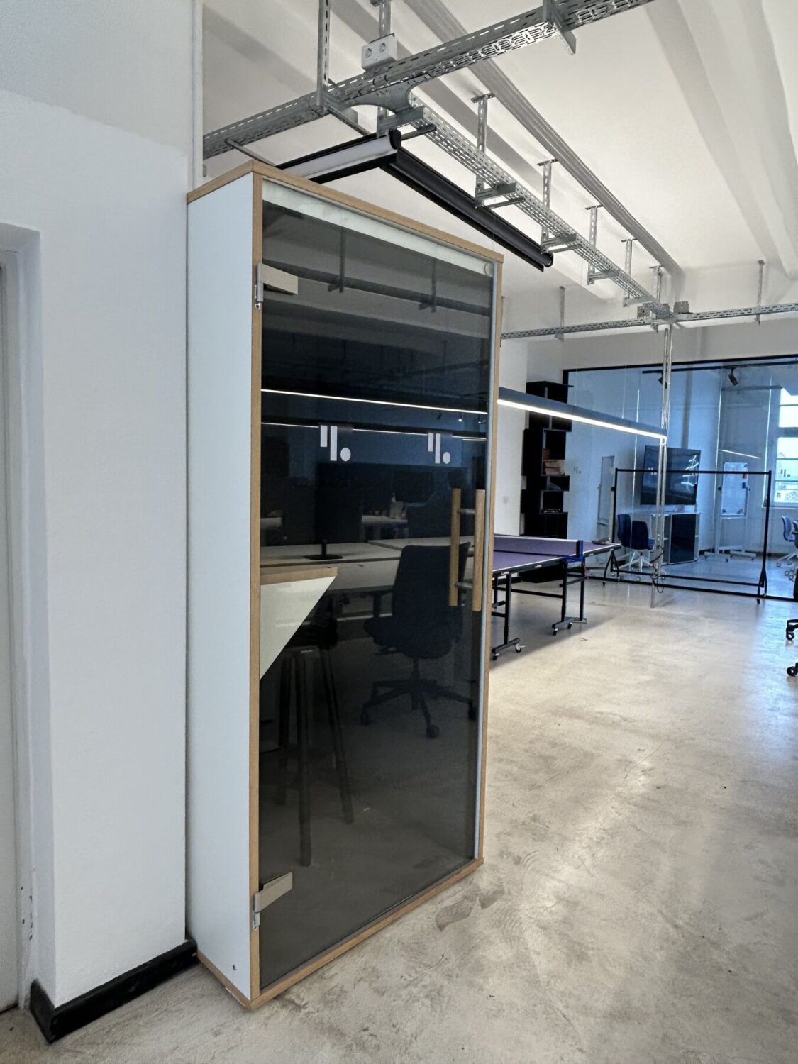 - Meetingpoints mit modernen Glaswänden, Einbauküche, Einbauschränke, Podest-Möbel können übernommen werden