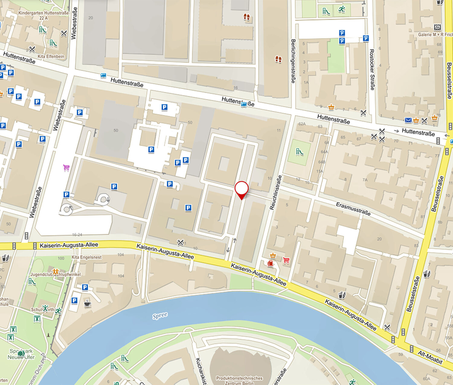 Eine reizvolle Umgebung erwartet die Mieter zwischen Huttenstraße und Kaiserin-Augusta-Allee in der Reuchlinstraße: Einerseits schlängelt sich die Spree unmittelbar an dem GSG-HOF mit seinen acht Alt- und Neubauten in einem eleganten Bogen entlang. Andererseits herrscht durch ihre vielen Geschäfte quirliges Treiben in der nahen Turmstraße und in der Kaiserin-Augusta-Allee, über die man Zugang zum Gelände hat.