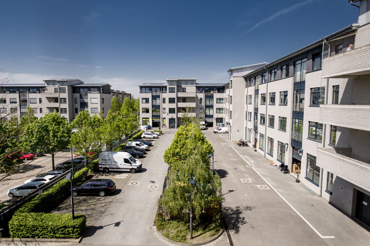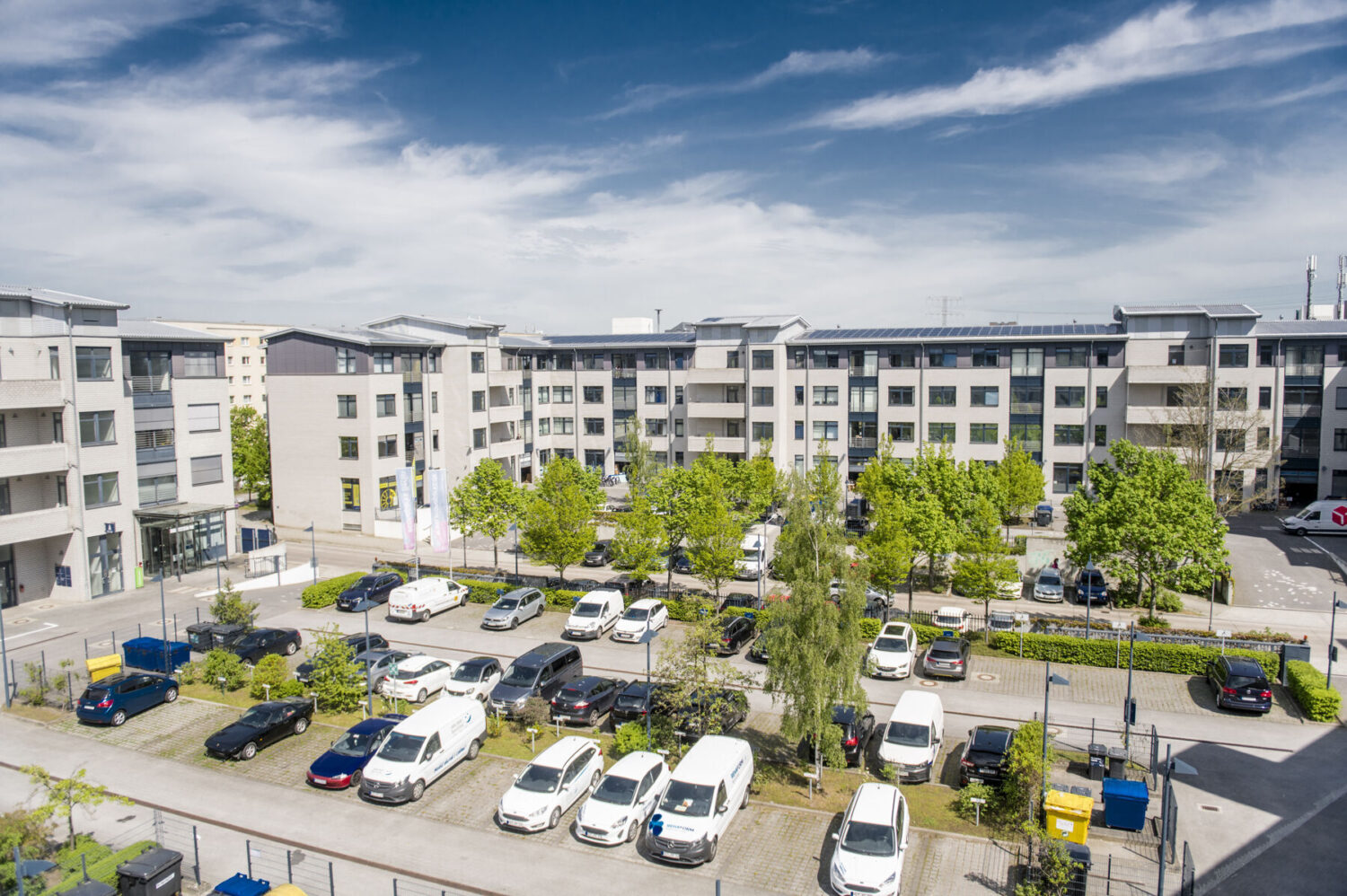 Die neun Gebäudeteile mit flexiblen Raumeinteilungen haben jeweils zwei Obergeschosse und ein Dachgeschoss. Allen Mieteinheiten stehen Personen- und Lastenaufzüge sowie Gegensprech- und Klingelanlagen zur Verfügung. Alle Büroetagen in den Dachgeschossen sowie das komplette Haus II sind zudem mit einem innenliegenden Sonnenschutz, Linoleumboden und Deckenbeleuchtungen ausgestattet. Jede Gewerbeeinheit hat separate Damen- und Herren-WC's sowie Wasseranschlüsse und Fliesenspiegel für Teeküchen.