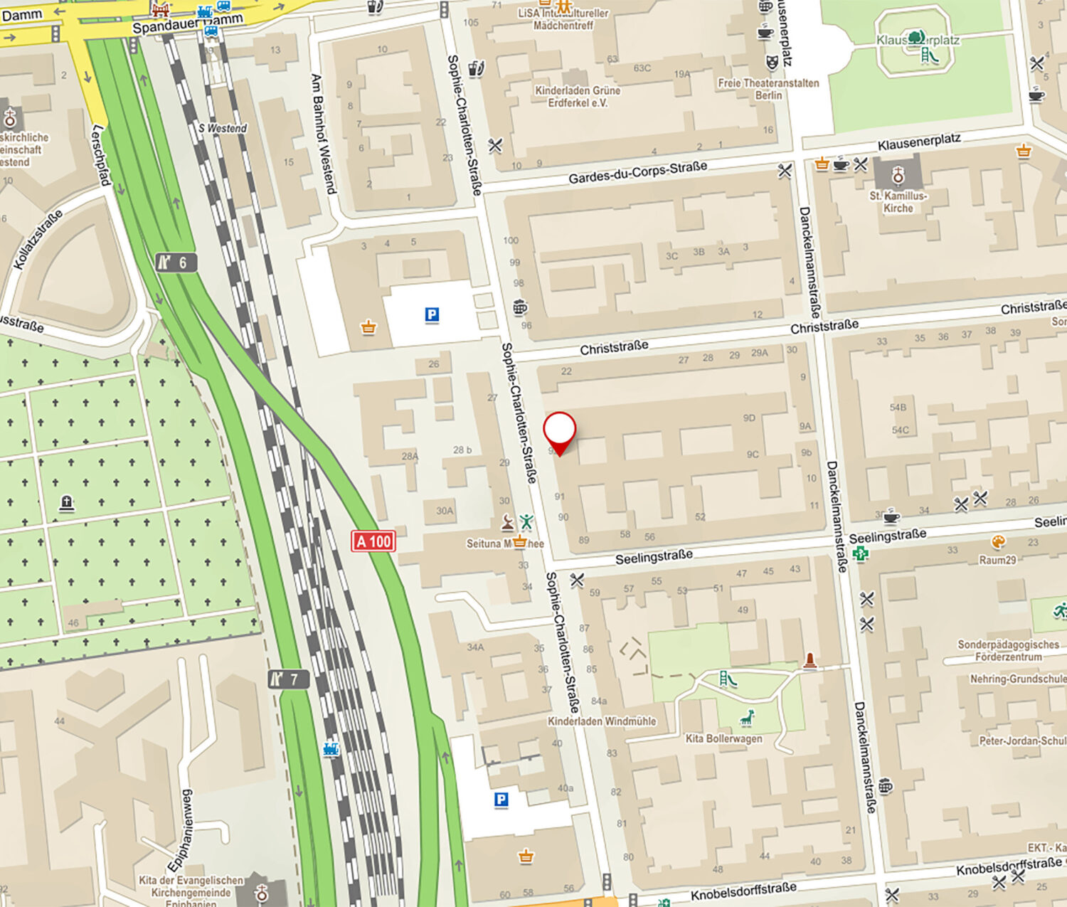Verkehrsgünstiger geht es kaum. Fast direkt an der Abfahrt Spandauer Damm der Stadtautobahn A 100 gelegen. Die U-Bahn-Station Sophie-Charlotte-Platz (U2) und der S-Bahnhof Westend (Ringbahn) sind bestens zu Fuß zu erreichen.