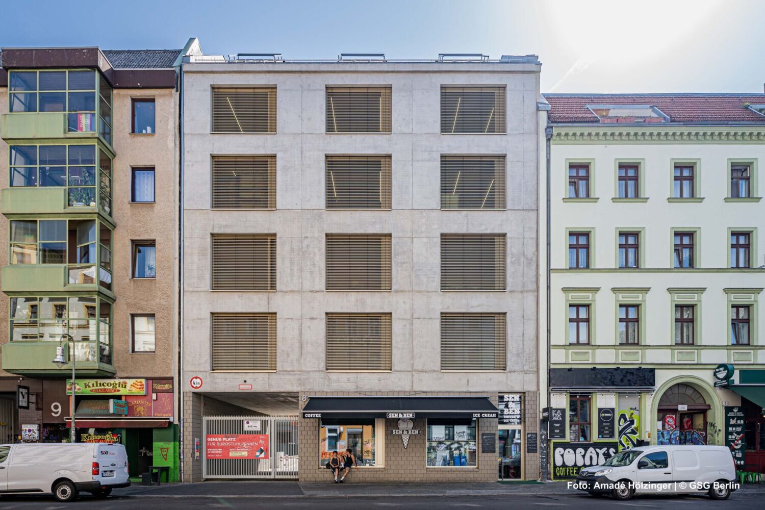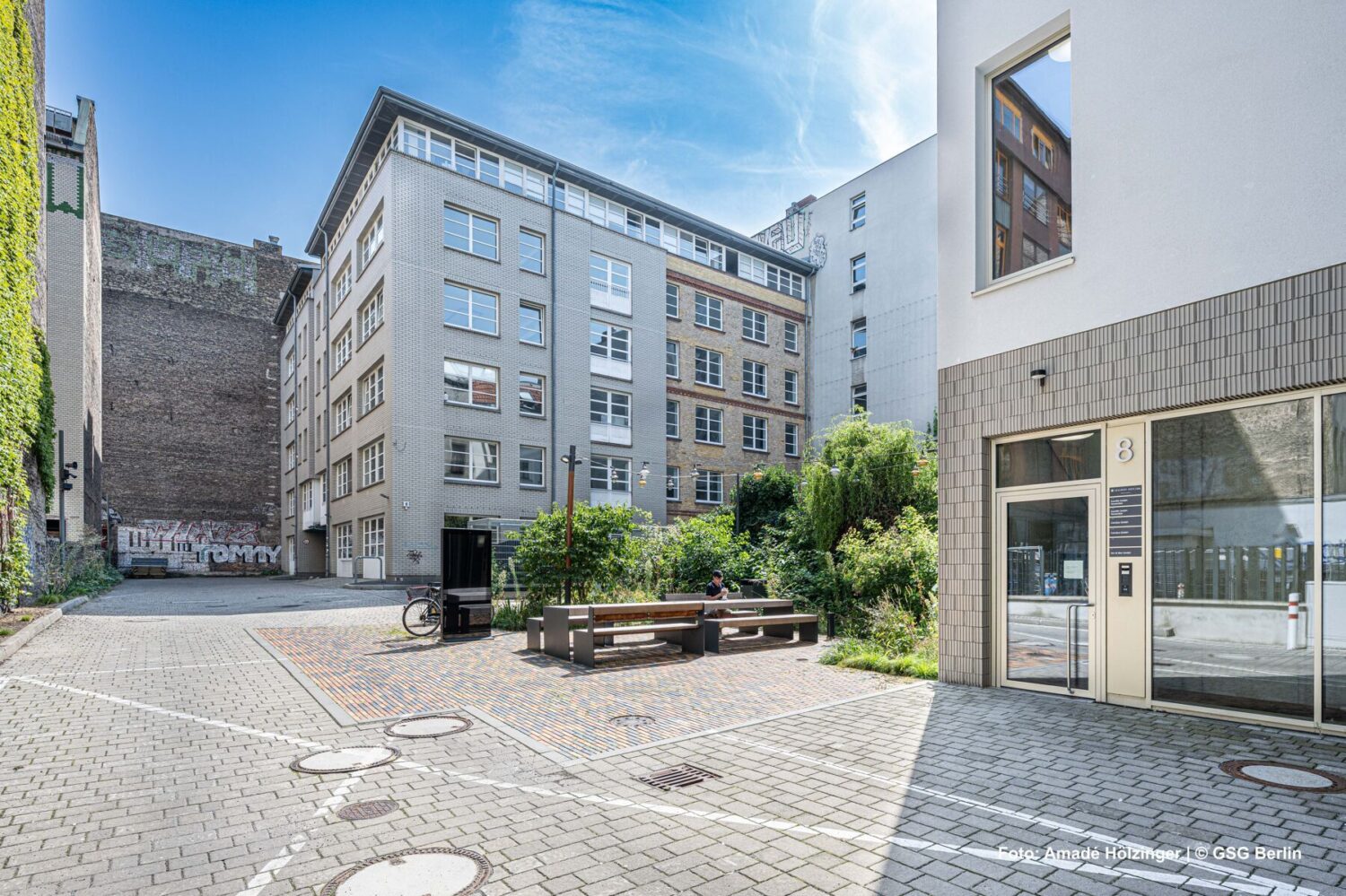 Arbeiten und leben, dazu noch in einem inspirierenden Umfeld voller Gegensätze – diese Dinge lassen sich in diesem Gewerbehof der GSG in der Adalbertstraße in Berlin-Kreuzberg aufs Wunderbarste verknüpfen: So kann man türkische Spezialitäten der dort angesiedelten Geschäfte, Restaurants oder Bäckereien genießen, während drum herum ein ambitioniertes Szenepublikum agiert.Der Hof wurde in diesem Jahr auch noch durch zwei moderne Neubauten ergänzt (Schließung von zwei Baulücken). Auch wurden/werden die Außenanlagen durch farbige Akzente, einladendes indirektes Licht in den Durchgängen, maximale Nutzfläche unter den Bäumen, bodentiefe Beete und Sitzmöglichkeiten für Mieter und Besucher aufgewertet.
