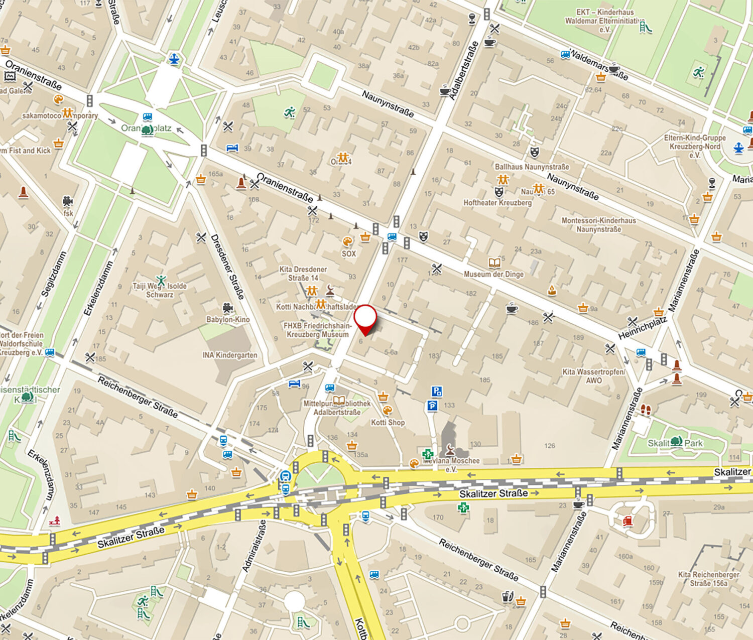 Die Adalbertstraße ist ein zentraler Mittelpunkt von Berlin-Kreuzberg, wo Sie zahlreiche Geschäfte und Dienstleistungen vorfinden. Rund um die Oranienstraße und das Kottbusser Tor gibt es verschiedene Einkaufsmöglichkeiten und internationale Gastronomie. Den Potsdamer Platz oder die exklusiven Geschäfte der Friedrichstraße erreichen Sie in ca. 10 Autominuten.