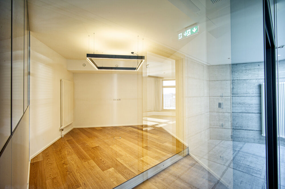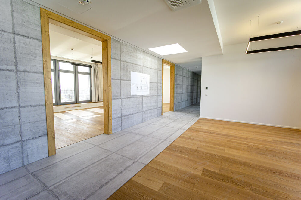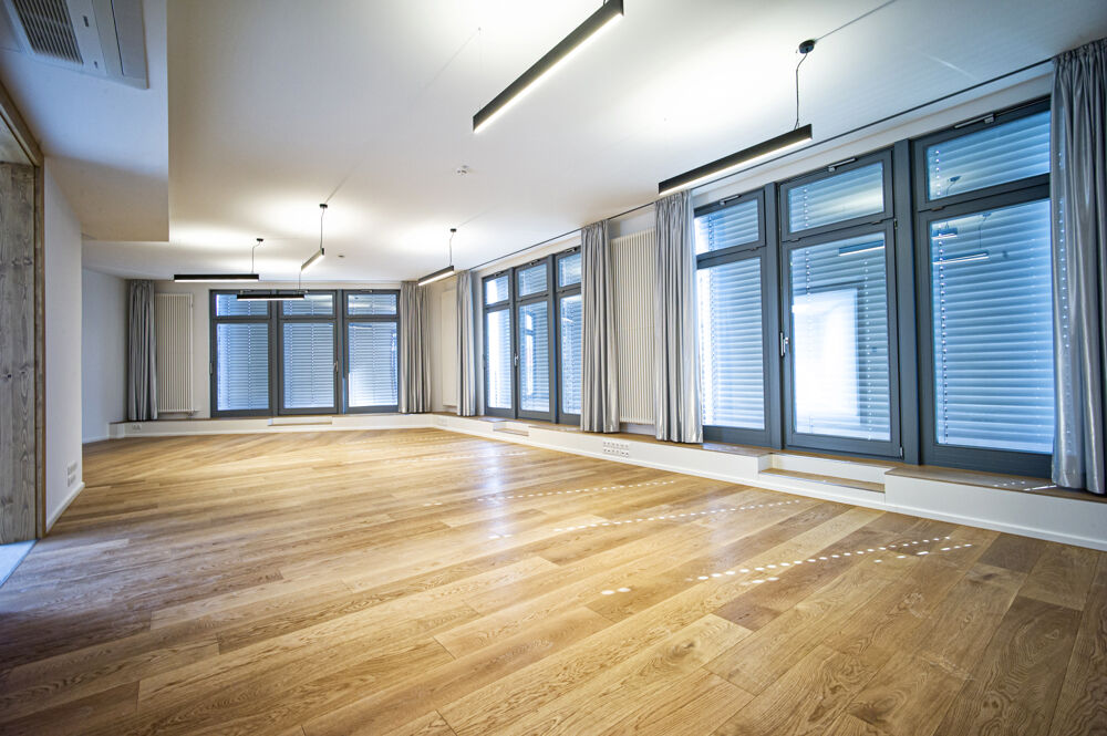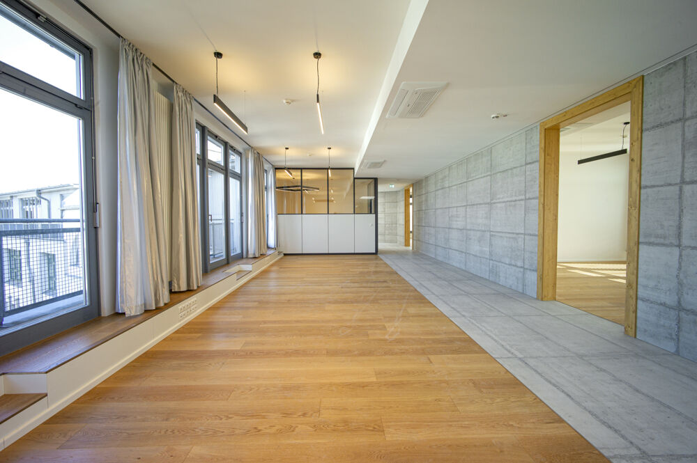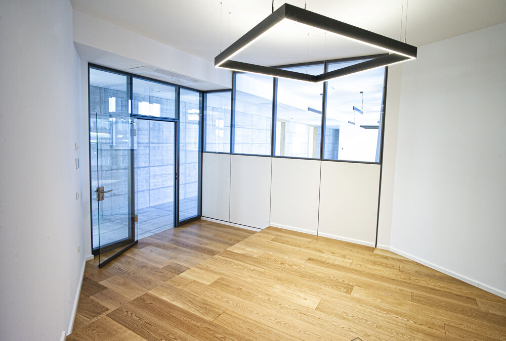Die Ausstattung erfüllt höchste Ansprüche: Edles Eichenparkett in den Arbeitsbereichen, stilvolle Fliesen in Betonoptik in Küchen-, Flur- und Sanitärzonen sowie eine moderne Elektro- und IT-Infrastruktur mit integrierter Beleuchtung sorgen für ein angenehmes und funktionales Arbeitsumfeld. Ergänzt wird dies durch ein vorhandenes Kühlsystem, außenliegenden Sonnenschutz mit elektrischer Steuerung, innenliegenden Blendschutz sowie praktische Details wie einen elektrischen Türöffner und vorbereitete Küchenanschlüsse.